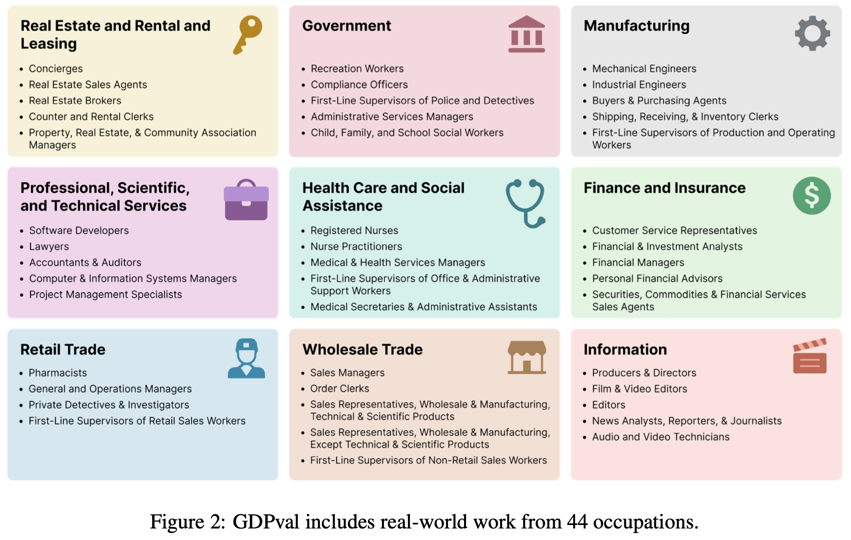 The first paper that is published by OpenAI is called GDPval - a dataset that tracks economically valuable industries and provides examples of tasks done by experts in high-paying roles within these industries. Instead of inventing synthetic benchmarks, they asked: “What digital jobs actually matter to the US economy?” They mined the Department of Labor’s database, filtered for occupations that are both high-paying and digitally focused, then had actual experts in those roles create representative tasks.